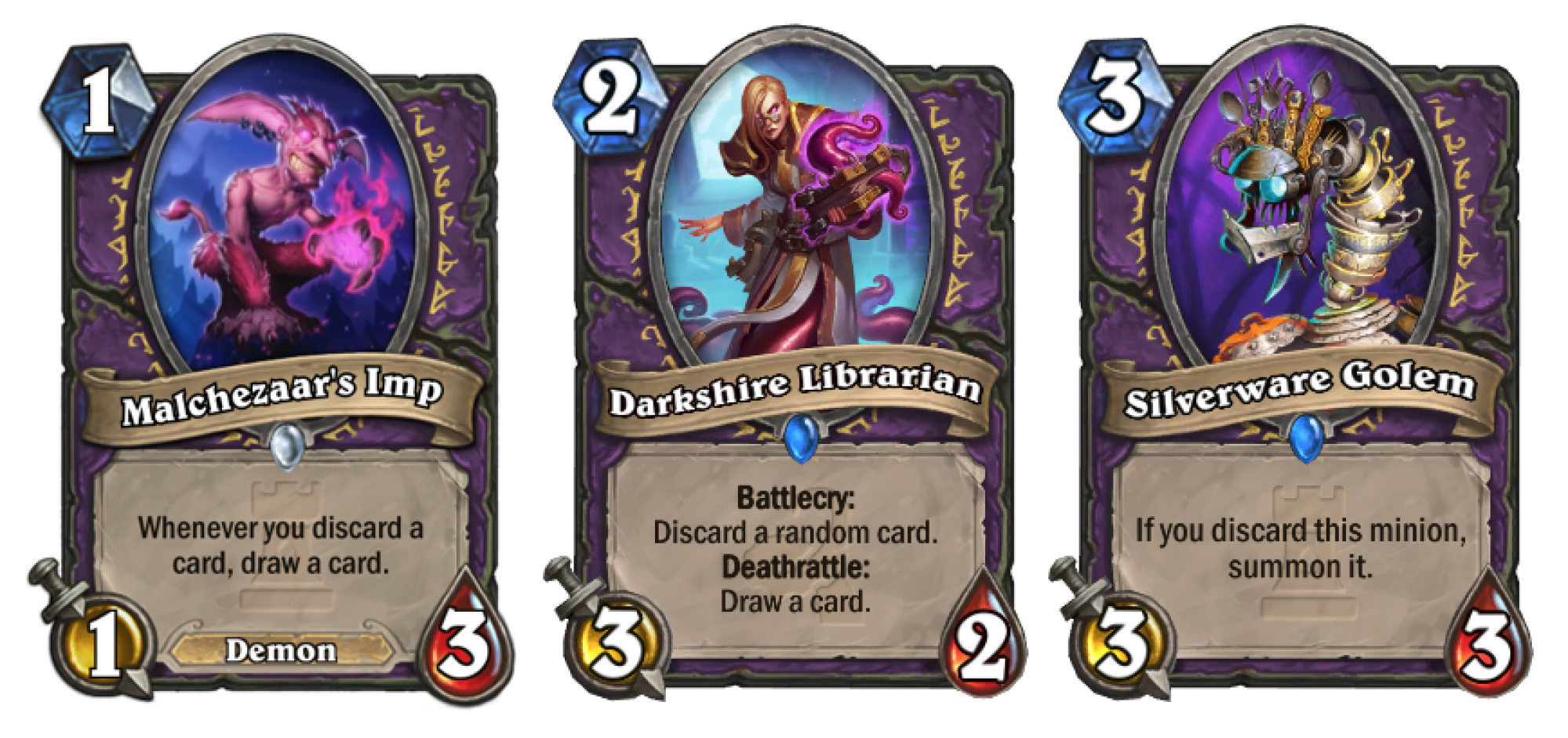 For the more adventurous Warlock players, One Night in Karazhan has introduced an alternate deck option centered around the discard mechanic. In this version, you’d swap in cards such as Malchezaar’s Imp, Darkshire Librarian and Silverware Golem. These cards can give you extra swing on turns when you wind up discarding, so your Doomguard and Soulfire become even more powerful.
