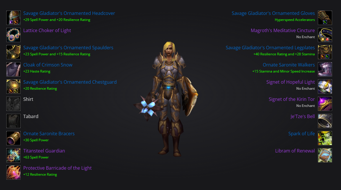 Helm: Savage Gladiator’s Ornamented HeadcoverNeck: Lattice Choker of LightShoulders: Savage Gladiator’s Ornamented SpauldersBack: Cloak of Crimson SnowChest: Savage Gladiator’s Ornamented ChestguardBracers: Ornate Saronite BracersGloves: Savage Gladiator’s Ornamented GlovesBelt: Magroth’s Meditative CinctureLegs: Savage Gladiator’s Ornamented LegplatesBoots: Ornate Saronite WalkersRing 1: Signet of Hopeful LightRing 2: Signet of the Kirin TorTrinket 1: Je’Tze’s BellTrinket 2: Spark of LifeWeapon: Titansteel GuardianShield: Protective Barricade of the LightLibram: Libram of Renewal