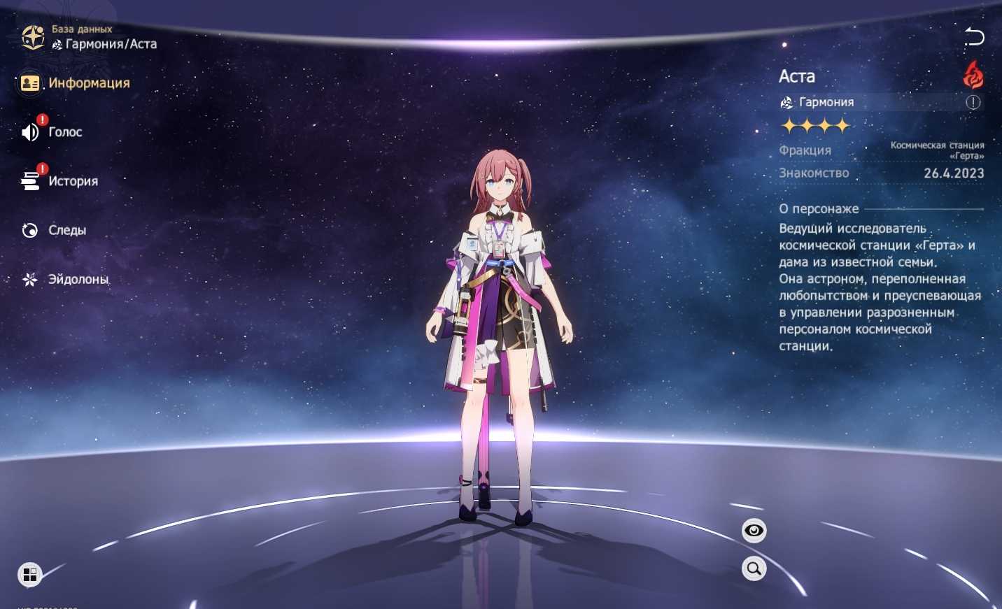 Аста выдается за первый прыжок в прологе. Она относится к персонажам поддержки (ускоряет союзников, усиливает наносимый ими урон, пробивает вражескую защиту). Ее можно использовать на ранних этапах игры, особенно в боях с противниками, уязвимыми к огню.