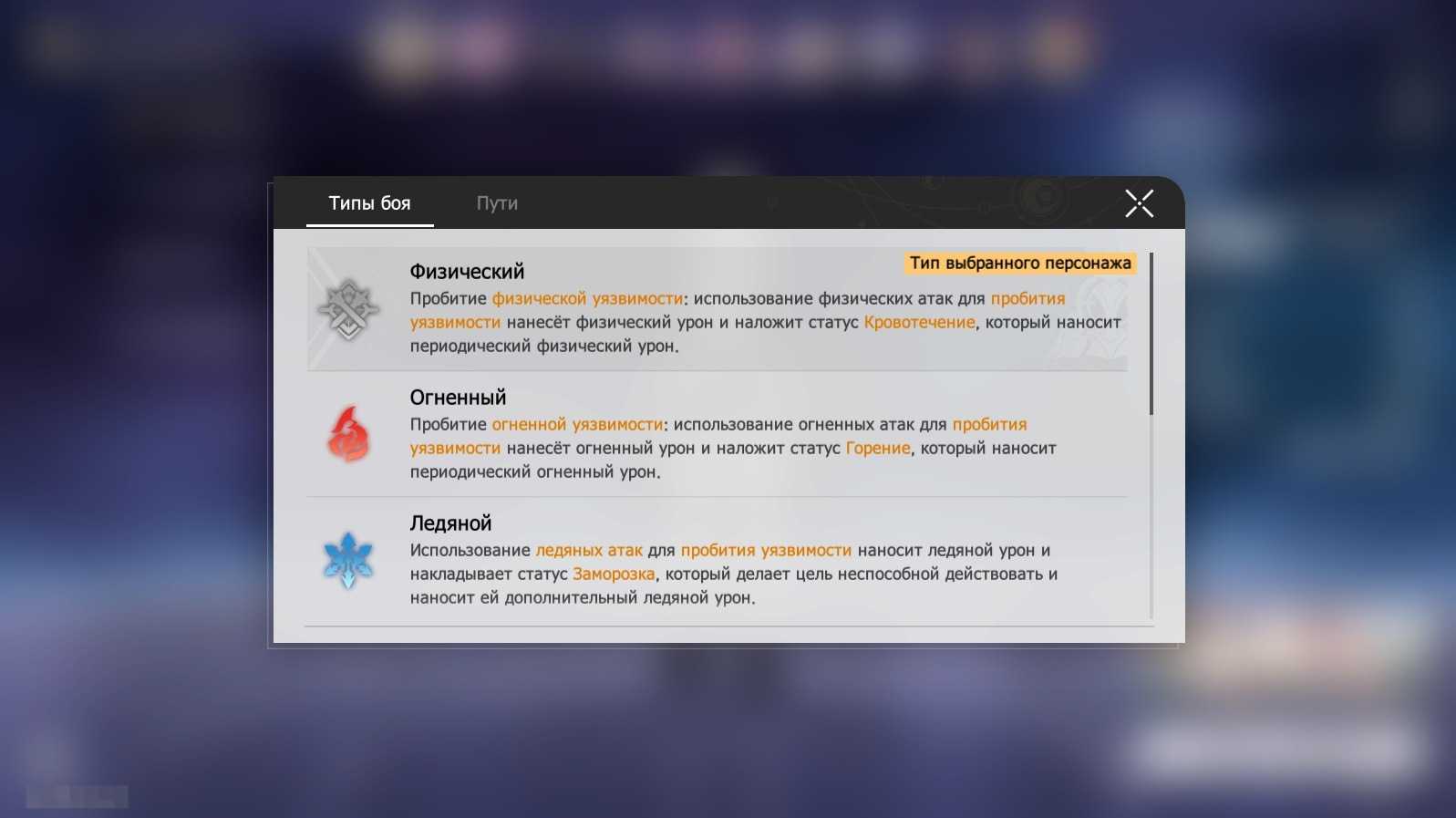 В Honkai: Star Rail каждый персонаж имеет атрибут Стихии. Она определяет тип наносимого в бою урона: Физический, Огненный, Ледяной, Электрический, Ветряной, Мнимый и Квантовый.