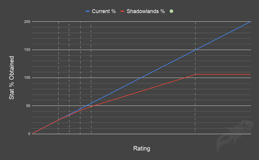 Сейчас, в Battle for Azeroth, вторичные характеристики возрастают линейно. Это означает, что если вы повышаете свой рейтинг скорости на Х ед., то он всегда повышает ваш показатель скорости на Y% независимо от того, как много рейтинга у вас уже есть. В Shadowlands, судя по всему, разработчики решили отойти от этой модели, введя постепенное ослабевание эффективности (так называемый “diminishing returns”) для вторичных характеристик, это – критический удар, скорость, универсальность и искусность. Что касается искусности, то речь идет именно об очках искусности, а не процентах, поскольку у каждого класса очки по-своему переводятся в проценты.