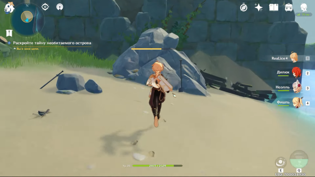 - Западное скопление Анемо можно найти на сломанной полузатонувшей колонне. Возможно, вам понадобится использовать Кэйа, чтобы заморозить воду и добраться до него.
