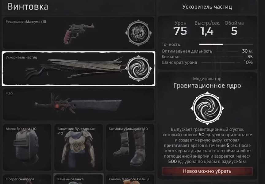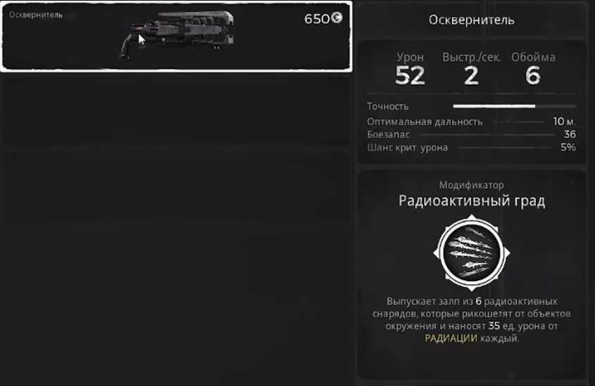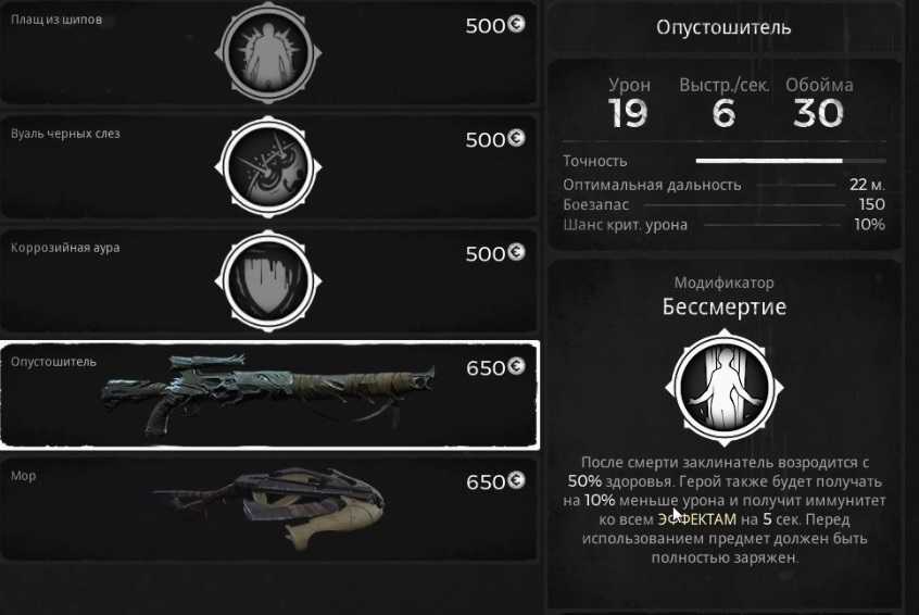 Винтовка имеет свойство делать вас бессмертным после заполнения модификатора. К слову, в недавнем патче ее пофиксили и теперь модификатор заполняется раза в 3 дольше. Но все еще этот ствол хорош – стреляет очередями по 3 патрона и бодро дамажит. Очень хороша для критового билда ввиду скорострельности. Если на винтовке зарядился модификатор, то можно переключиться на вторичку, а эффект останется.