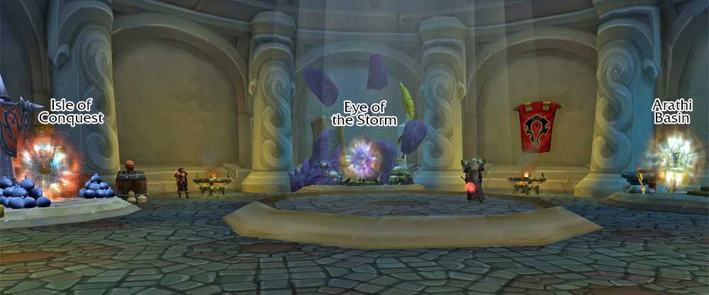 Поле сражений Орды в Даларане находится в Святилище Похитителей Солнца. Поднимитесь по крайней левой лестнице, и вы окажетесь в прихожей, ведущей в две разные комнаты, ведущие налево и направо. Порталы разделены между этими комнатами: