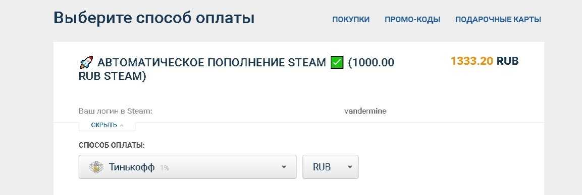 Этот способ пополнения баланса Стим работает намного стабильнее, чем два вышеописанных. Однако комиссия здесь выше. Плюс теряются деньги при конвертации валют.