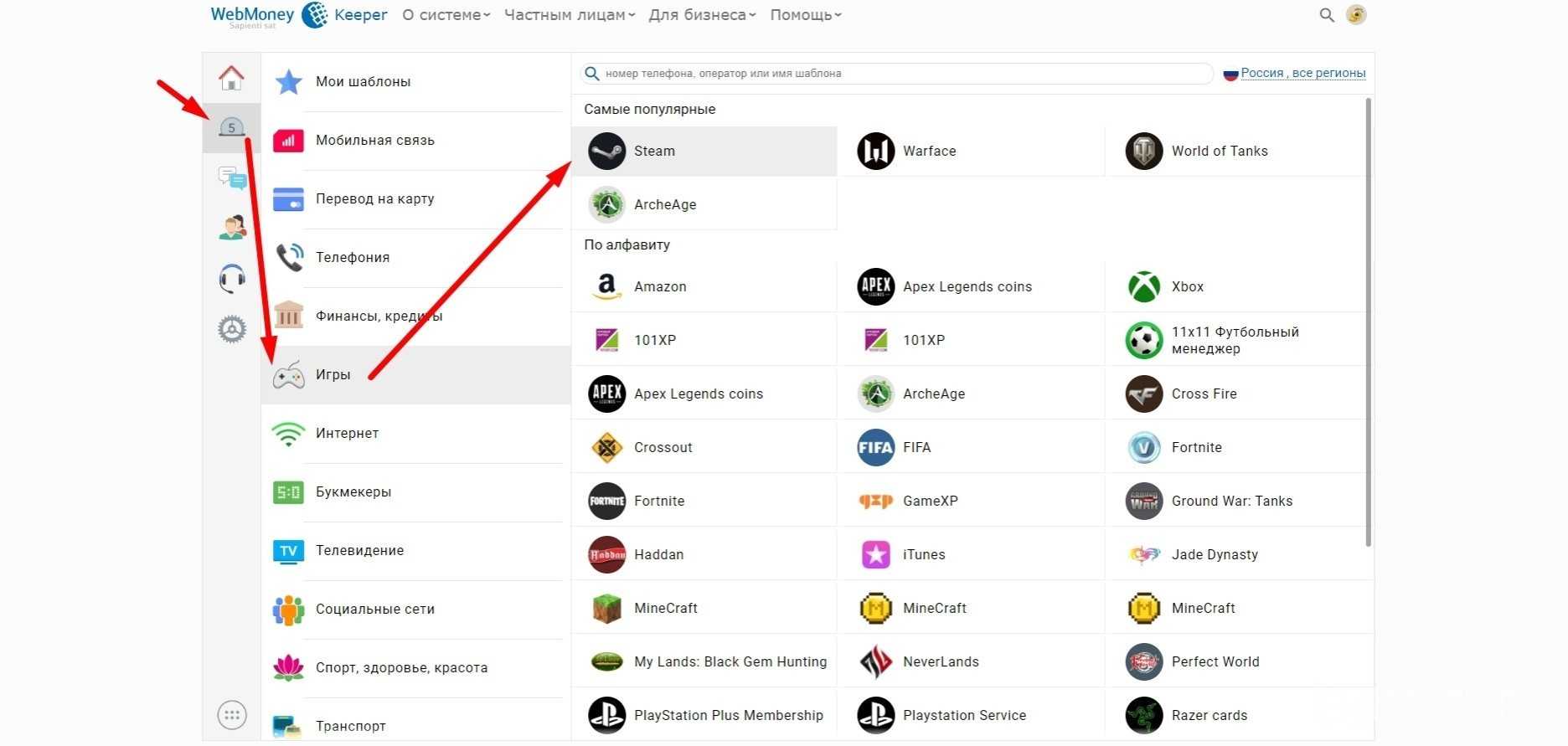 Чтобы пополнить кошелек Steam через Вебмани необходимо внести деньги на электронный счет (с помощью любой банковской карты РФ), затем выбрать «Платежи» —> «Игры» —> Steam (см. скриншот ниже).