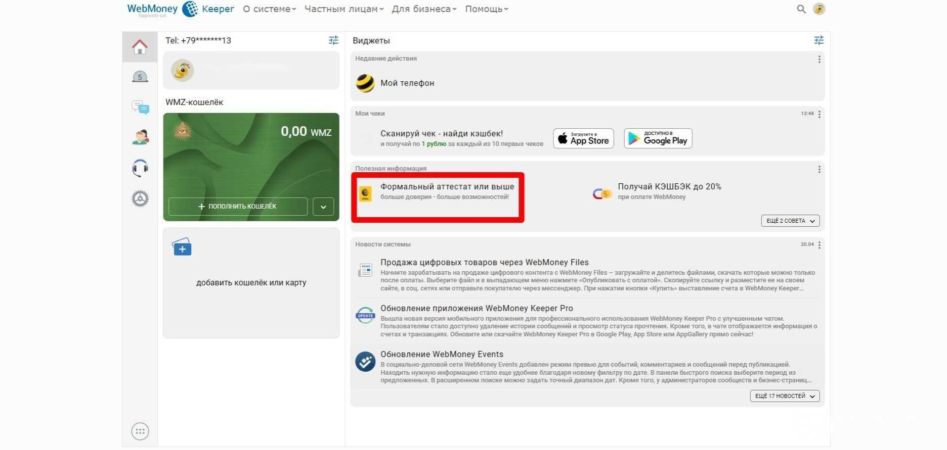 Если у вас ещё нет кошелька в WebMoney, то зарегистрируйтесь там. Регистрация происходит на номер телефона. Затем получите формальный аттестат — это самый низший бесплатный аттестат, который позволяет производить транзакции с кошелька. Для получения формального аттестата понадобится паспорт, поэтому это доступно только с 14 лет. Для упрощённого получения формального аттестата воспользуйтесь сервисом Госуслуги.