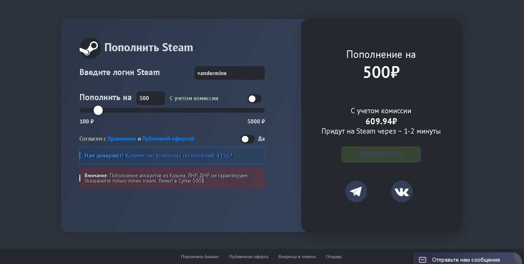 В 2023 году подобных сайтов существует не один десяток. И все они популярны. Пользователи чаще всего прибегают к их услугам, так как здесь меньше всего нужно заморачиваться. Ввел логин Стим, сумму и нажал «Оплатить». Однако также существует риск быть обманутым. Мошенники не дремлют: они создают очень похожие сайты на популярные сервисы пополнения Steam баланса и воруют деньги.