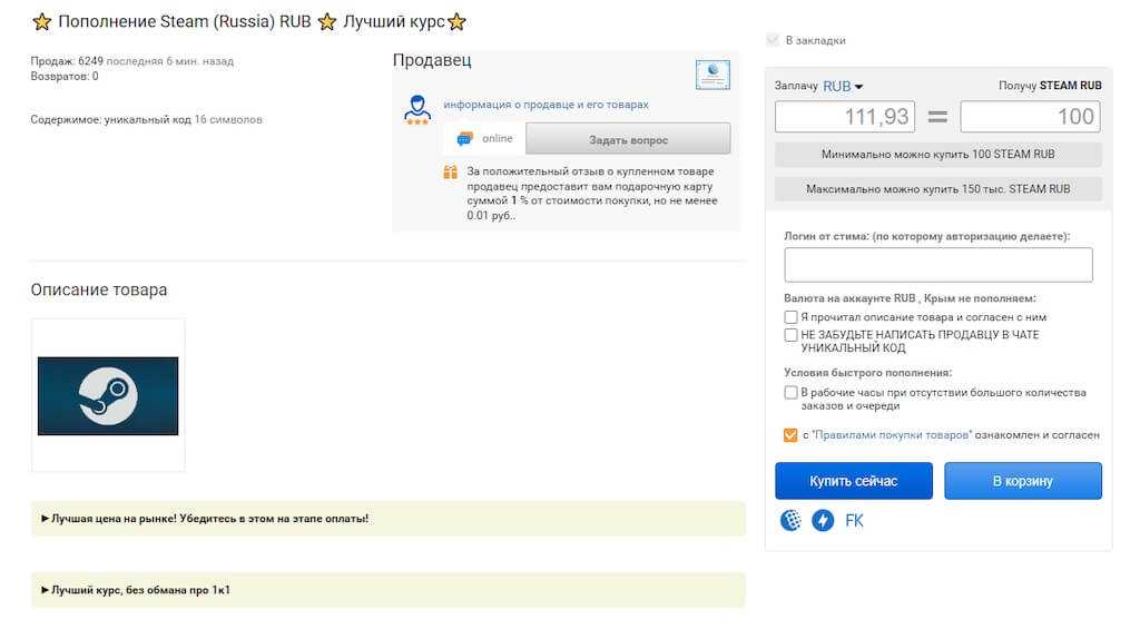 Внимательно изучите условия, предлагаемые продавцами. Изучите, какую комиссию они берут за свои услуги, как быстро пополняют аккаунт и какой валютой, какие отзывы имеет продавец. Если предложение вас устроит, выбирайте предложение, и оплатите нужную сумму на счёт продавца. Через короткое время сумма будет на вашем счету в Стим.