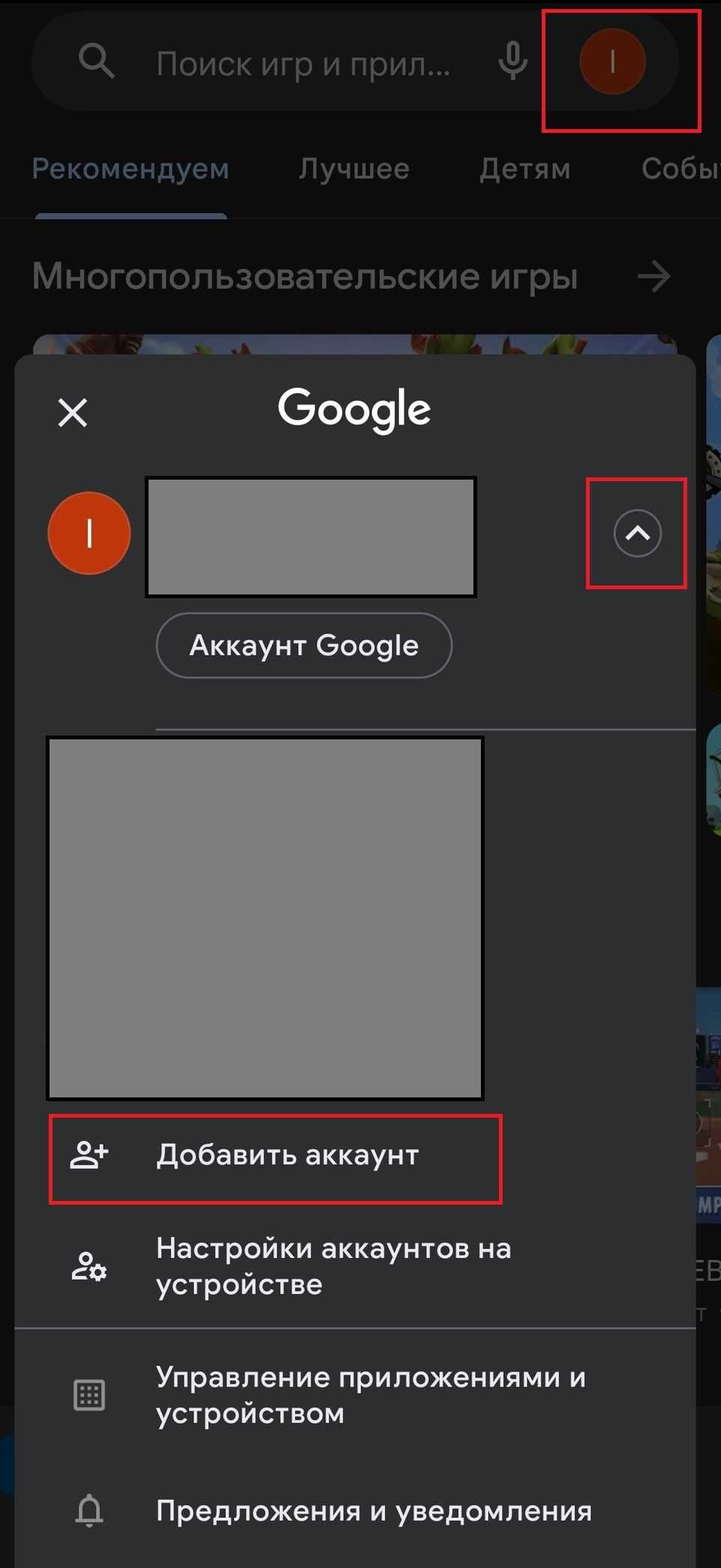 - Открываем Play Market, нажимаем на иконку вашего аккаунта, радом с ним будет стрелочка, нажимаем на нее и выбираем добавить аккаунт;