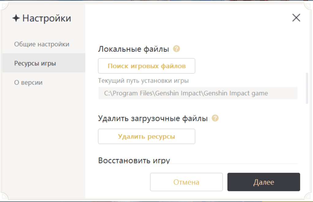 При выборе второго варианта дождитесь загрузки игрового лаунчера, а затем перейдите в «Настройки» (значок в виде шестеренки в правом верхнем углу) и откройте вкладку «Ресурсы игры». В ней укажите ту же папку, в которой до этого находилась Genshin Impact. После этого обновите игру.