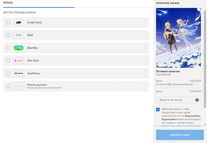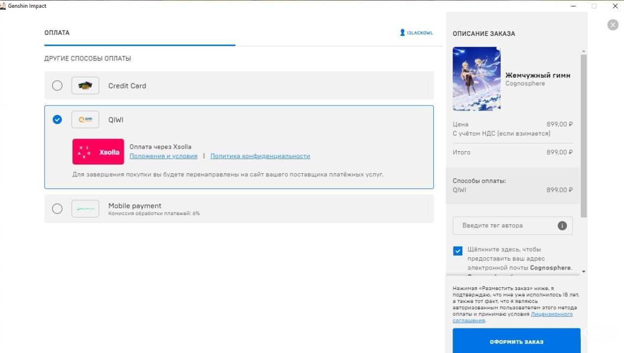 Теперь запустите проект через Epic Games Store, перейдите в магазин Паймон и выберите предмет, который хотите купить. Укажите QIWI в качестве способа оплаты. Отметим, что таким же способом можно приобрести Боевой пропуск.