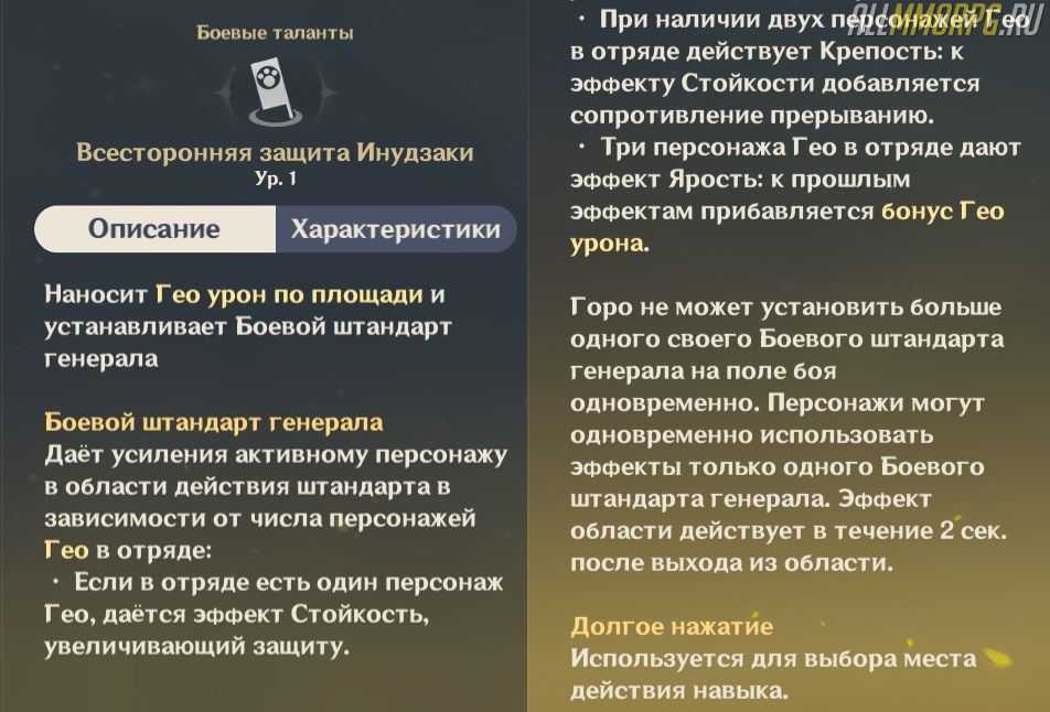 «Всесторонняя защита Инудзаки» позволяет разместить на земле Боевой штандарт, который усиливает активного героя в зависимости от количества персонажей стихии Гео в отряде.