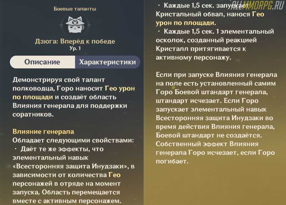 Горо – отличный герой поддержки, однако он будет максимально эффективен только в том случае, если в вашей коллекции есть несколько персонажей стихии Гео, поскольку их присутствие усиливает эффективность его способностей. К сожалению, у него нет никаких пассивных талантов, облегчающих исследование открытого мира, но он может указывать вам на местонахождение диковинок Инадзумы, что довольно полезно для тех игроков, которые занимаются фармом материалов.