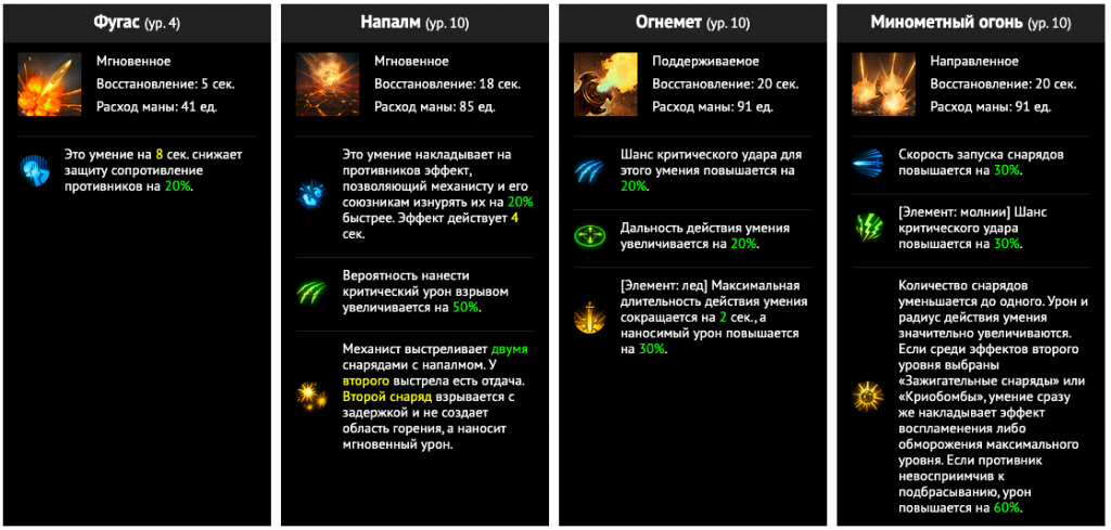 - Огнемет +8 — поджигает противников, нанося им периодический урон стихией огня. С помощью «Концентрированной смеси» можно повысить убойность скила в 2 раза.