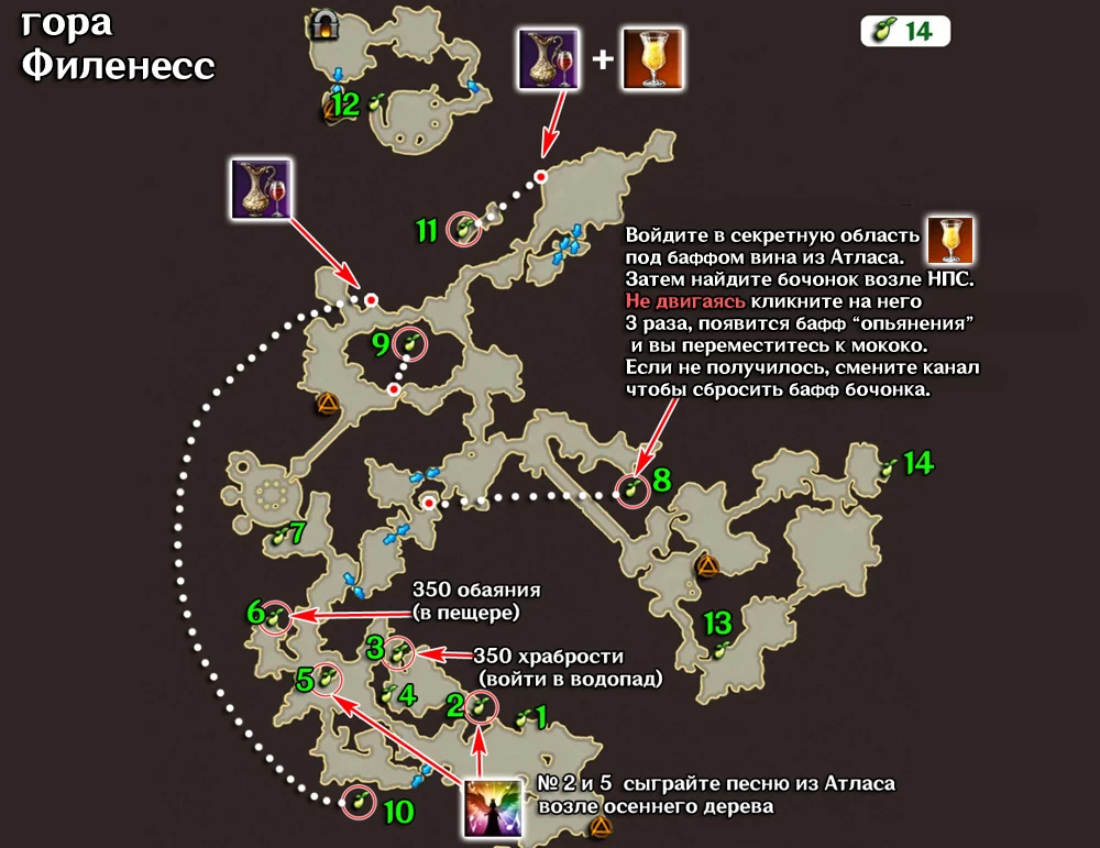 № 8 – Нужно подойти к секретной области, выпить бокал вина (седьмой рецепт Атласа) найти ангелочка с бочонком пива рядом с ним. Встаньте рядом с бочонком и кликните по нему несколько раз НЕ ДВИГАЯСЬ. У вас будет появляться бафф опьянения, и при достаточном баффе вы переместитесь к мококо.