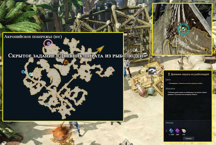Задание будет доступно после завершения сюжетного квеста Акронийского побережья «Беспутный Паоло». Вы найдете дневник в пиратском лагере на юге локации, в груде награбленных сокровищ.