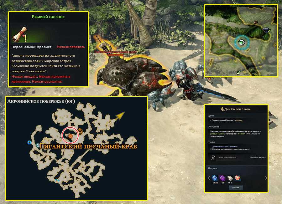 Не совсем скрытый квест, так как основной предмет, дающий задание, свиток «Ржавый ганлэнс» всегда выпадает из уникального противника Атласа «Гигантский песчаный краб», который водится неподалеку от южного портала локации.