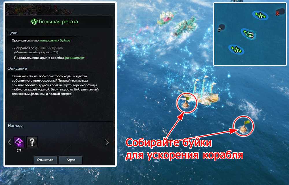 Еще одно забавное задание: «Большая регата». Нужно будет мчать на своем корабле, придерживаясь меток и собирая буйки, которые дают ускорение.