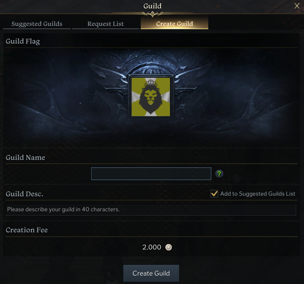 Для создания гильдии необходимо выполнить те же требования, что и для вступления. Игрок, который уже состоит в гильдии, не может создать свою собственную гильдию. Чтобы создать гильдию, нужно заплатить 2000 серебряных, зайти в интерфейс гильдии и открыть последнюю вкладку («Создать гильдию»). Придумайте название и описание гильдии, чтобы другие игроки могли понять, что их ждет.
