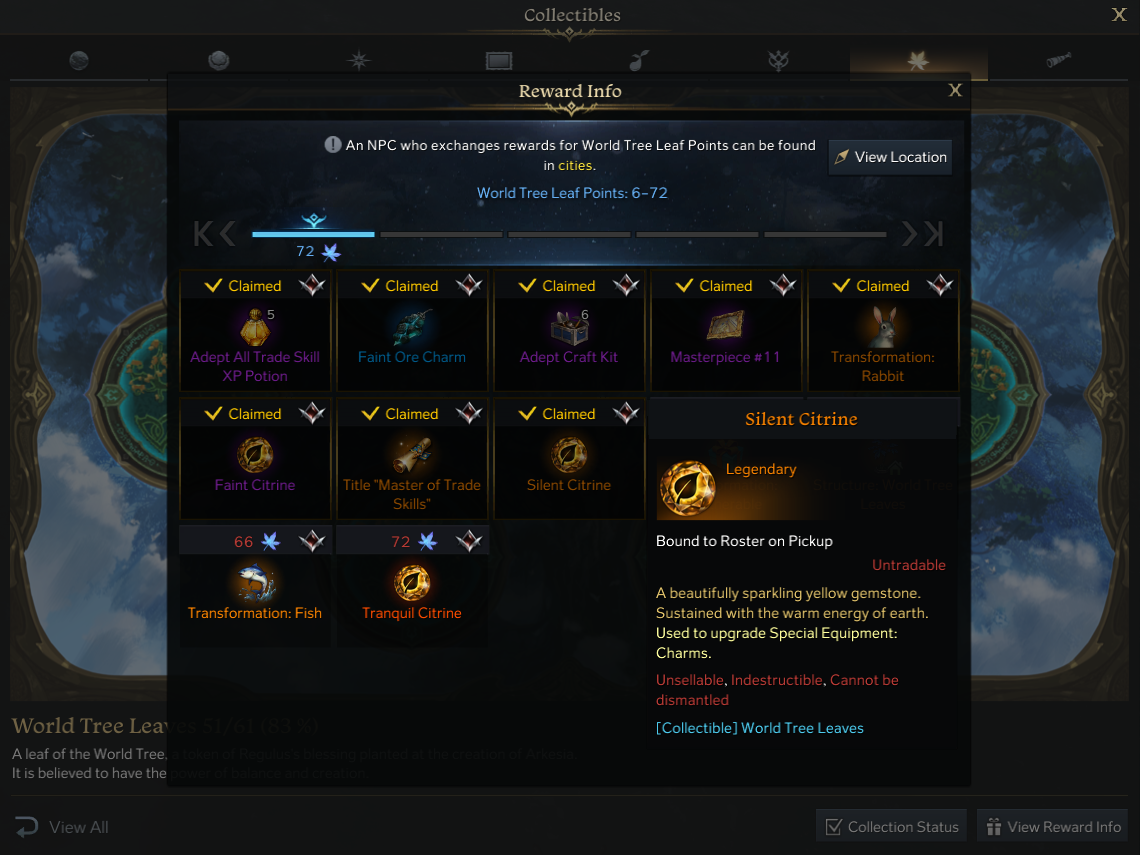 Материалы для амулета добываются с помощью побегов мирового древа (коллекционных предметов, отображаемых в соответствующем меню).