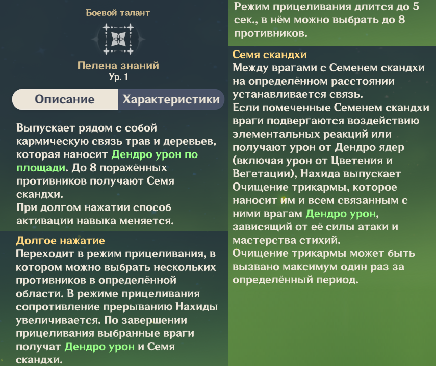 При использовании навыка «Акара» Нахида совершает до 4 ударов, наносящих урон от Дендро всем монстрам, стоящим перед ней. Заряженная способность – герой произносит заклинание, которое отнимает определенный процент выносливости и наносит стихийный урон всем врагам впереди.