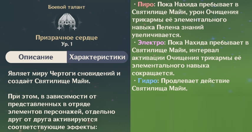 - №1 «Семя потаенных знаний». Когда Нахида создает Святилище Майи, при подсчете типов элементов героев к количеству Электро, Гидро и Пиро персонажей добавляется по 1.