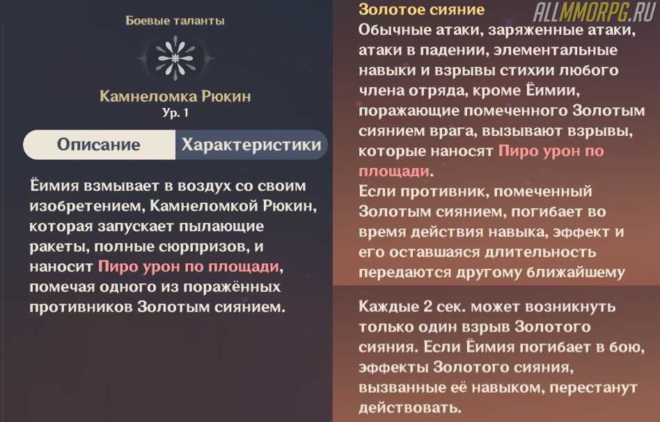 «Камнеломка Рюкин» – ультимейт Ёимии, который наносит АОЕ-урон от стихии Пиро. Один из врагов получает метку Золотого Сияния. При нанесении урона по монстру с Золотым Сиянием (всеми способами – взрыв стихий, элементальная способность, заряженная, обычная атака, атака в падении) любой герой из вашего отряда нанесет дополнительный АОЕ-урон от стихии Пиро вне зависимости от его базовой стихии.