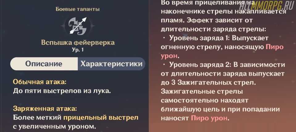«Вспышка фейерверка» является базовым умением героя. Обычная атака – совершает до 5 простых выстрелов из лука, заряженная – прицельный выстрел стрелой, заряженной стихией Пиро.
