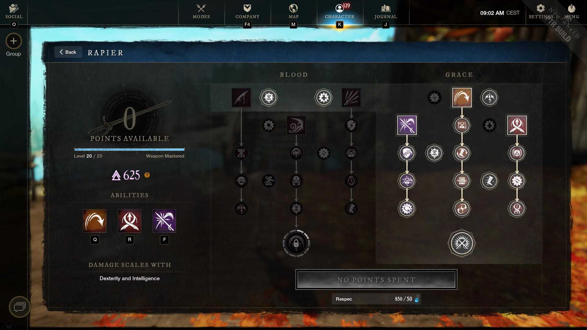 - Main stat attributes: 300 points into Dexterity, then Intelligence/Constitution