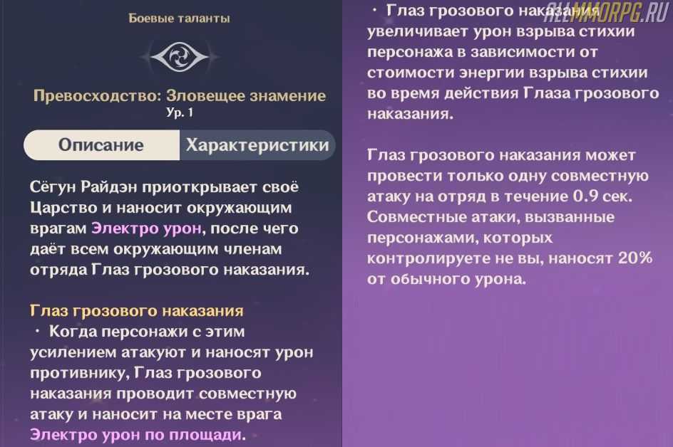 После активации способности «Превосходство: Зловещее знамение» Райдэн наносит всем врагам поблизости урон от стихии Электро и наделяет союзников эффектом «Глаз грозового наказания».