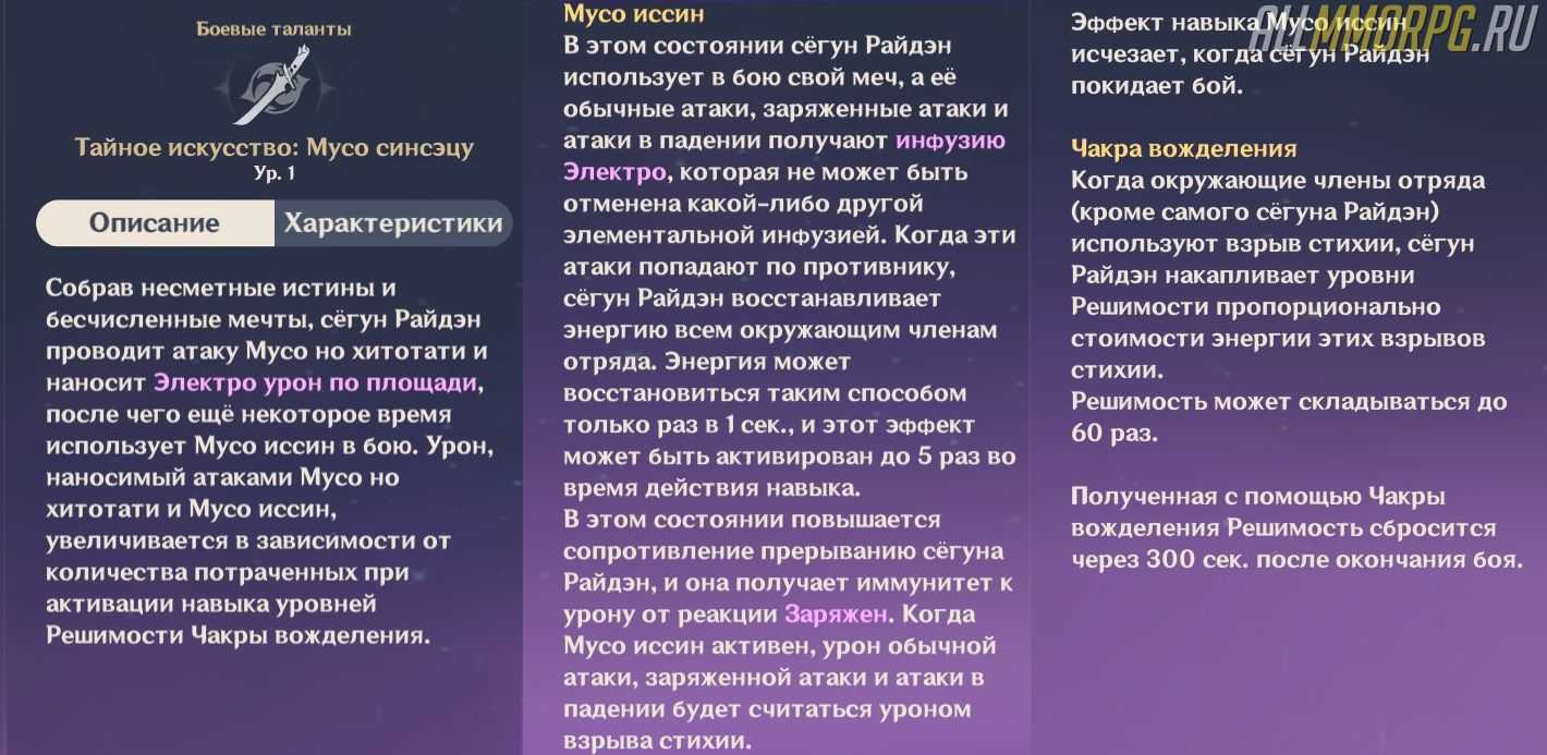 - Мусо иссин: Райдэн накладывает на противников электро инфузию и при каждой успешной атаке восполняет союзникам энергию. Дополнительно Мусо иссин защищает героя от прерываний и дает ему 100% иммунитет к реакции «Заряжен»;