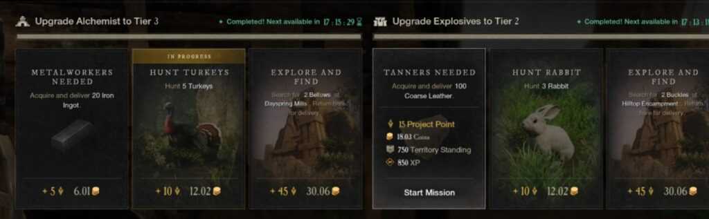 Самым эффективным способом прокачки уровня влияния на территории на текущий момент являются городские проекты (Town Project). Вы можете найти их в каждом поселении на доске у ратуши. Как правило, они не представляют особой сложности, от вас требуется охота на животных, сбор определенных ресурсов, или крафт необходимых для задания предметов.