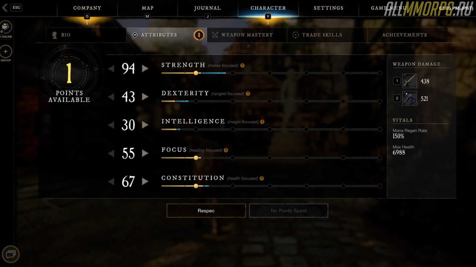 Для персонажа первого уровня каждый показатель равен 5. Очки, получаемые при повышении уровня, можно вкладывать в любой показатель. Максимальное количество очков без учета бонусов — 190. Дополнительные очки можно получить за счет бижутерии и драгоценных камней, которыми украшается броня и оружие.