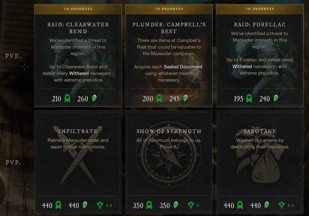 Присоединившись к одной из сторон, вы получаете доступ к фракционным заданиям. Существуют два типа заданий: PvE и PvP. Если для PvE заданий вас попросят собрать определенные ресурсы, скрафтить предметы, или убить существ, в PvP от вас потребуется добыча разведданных, саботаж и уничтожение вражеских ресурсов. Разумеется, для выполнения PvP-заданий вы должны будете включить этот режим. Гибель персонажа при выполнении такого задания будет означать провал миссии, что делает их значительно опаснее, однако в награду за выполнение помимо золота и фракционной валюты вы также повысите влияние вашей фракции на территорию. Кроме того, при включенном PvP вы будете получать больше опыта за любые действия.