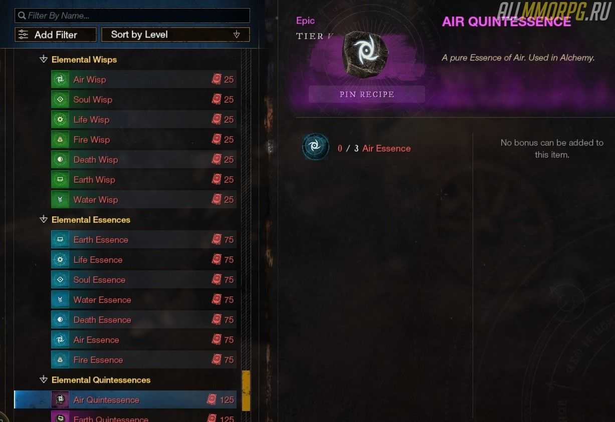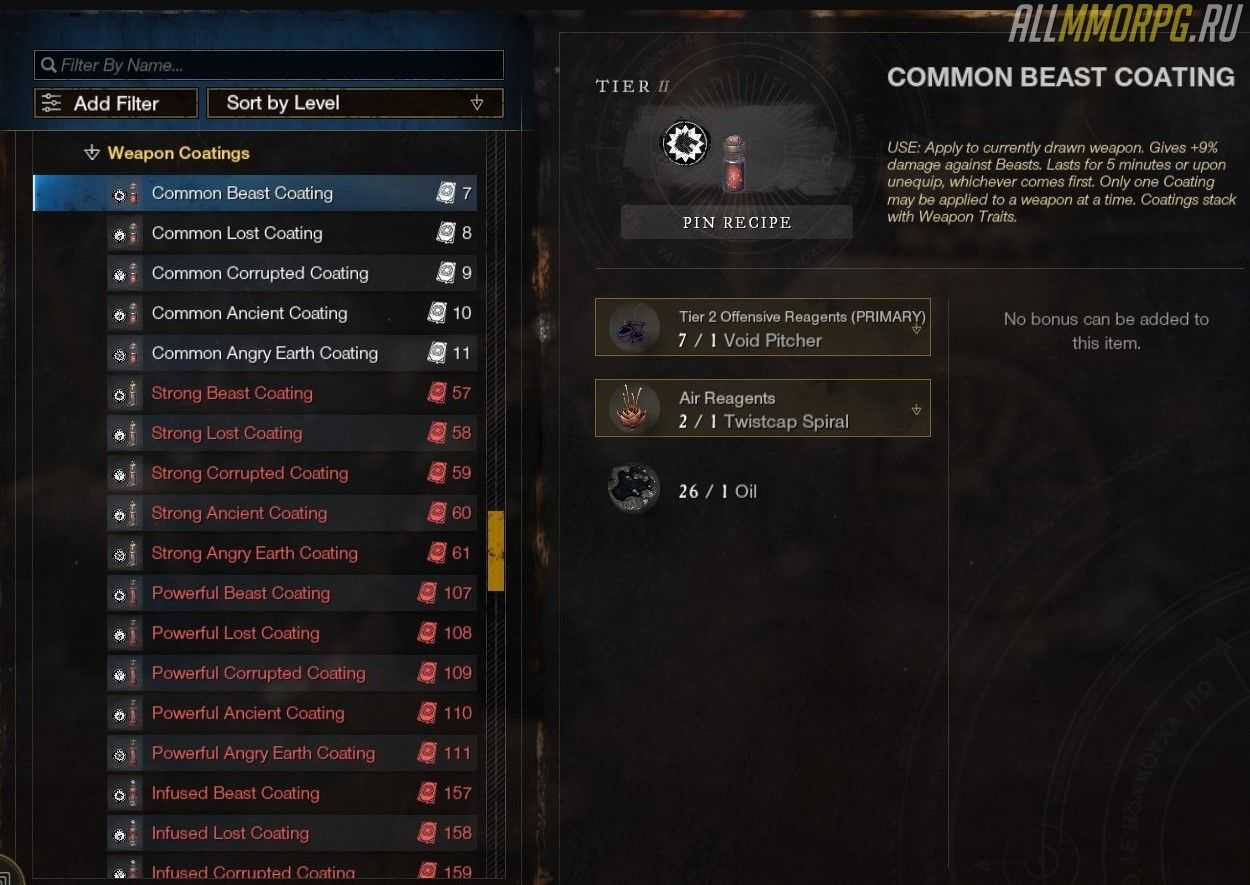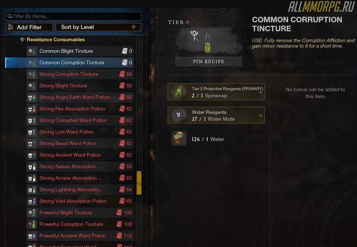 Примечание: использование высокоуровневых реагентов увеличивает вероятность создания дополнительных предметов и не влияет на количество опыта, поэтому мы рекомендуем вам использовать высокоуровневые реагенты только в высокоуровневых рецептах.