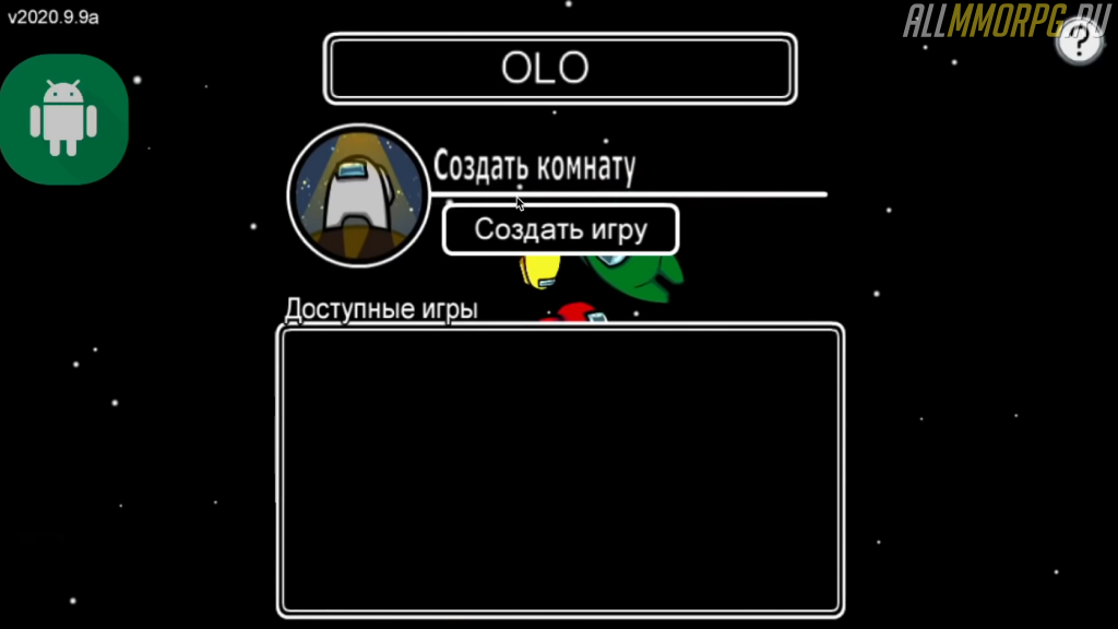 После того, как установка завершена, заходите в игру через новый ярлык, который появился у вас в меню мобильного устройства. Когда взломанная версия Among Us запустится (первый раз это происходит очень долго, так как нужно время для настройки клиента), слева на экране вы увидите такой значок: