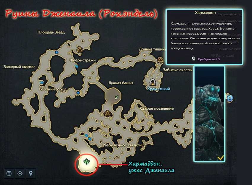 Найти Хармаддона не составит труда. Он появляется на юге локации «Руины Дженаила» в пятницу в 15:00, в сб и вс в 20:00 по московскому времени. Желательно иметь ГС не ниже 550, иначе придется потратить много воскрешений и вы не получите лута. Битва с ним – локальное событие, в которое нужно внести свой вклад, чтобы получить награды.