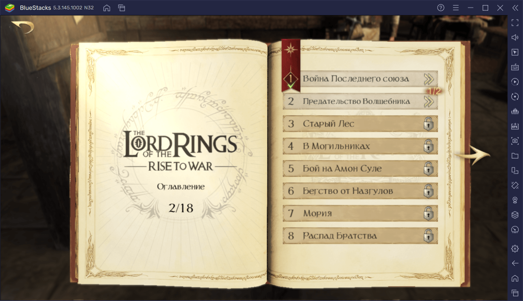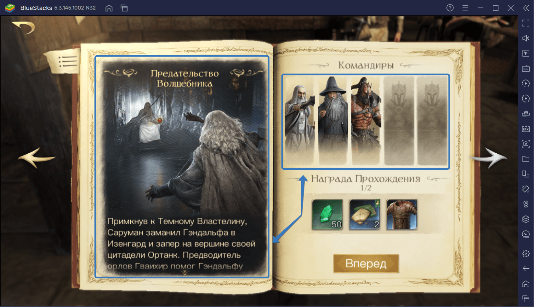 Нажимаем на кнопку «Вперед» и переходим на новый экран. Как видите, вторая глава делится на два этапа: на первом вы будете играть за армию Сарумана, а на втором — поможете Гэндальфу сбежать из заточения. За каждый из этапов вы получите ресурсы и общее ускорение процессов на пять минут.