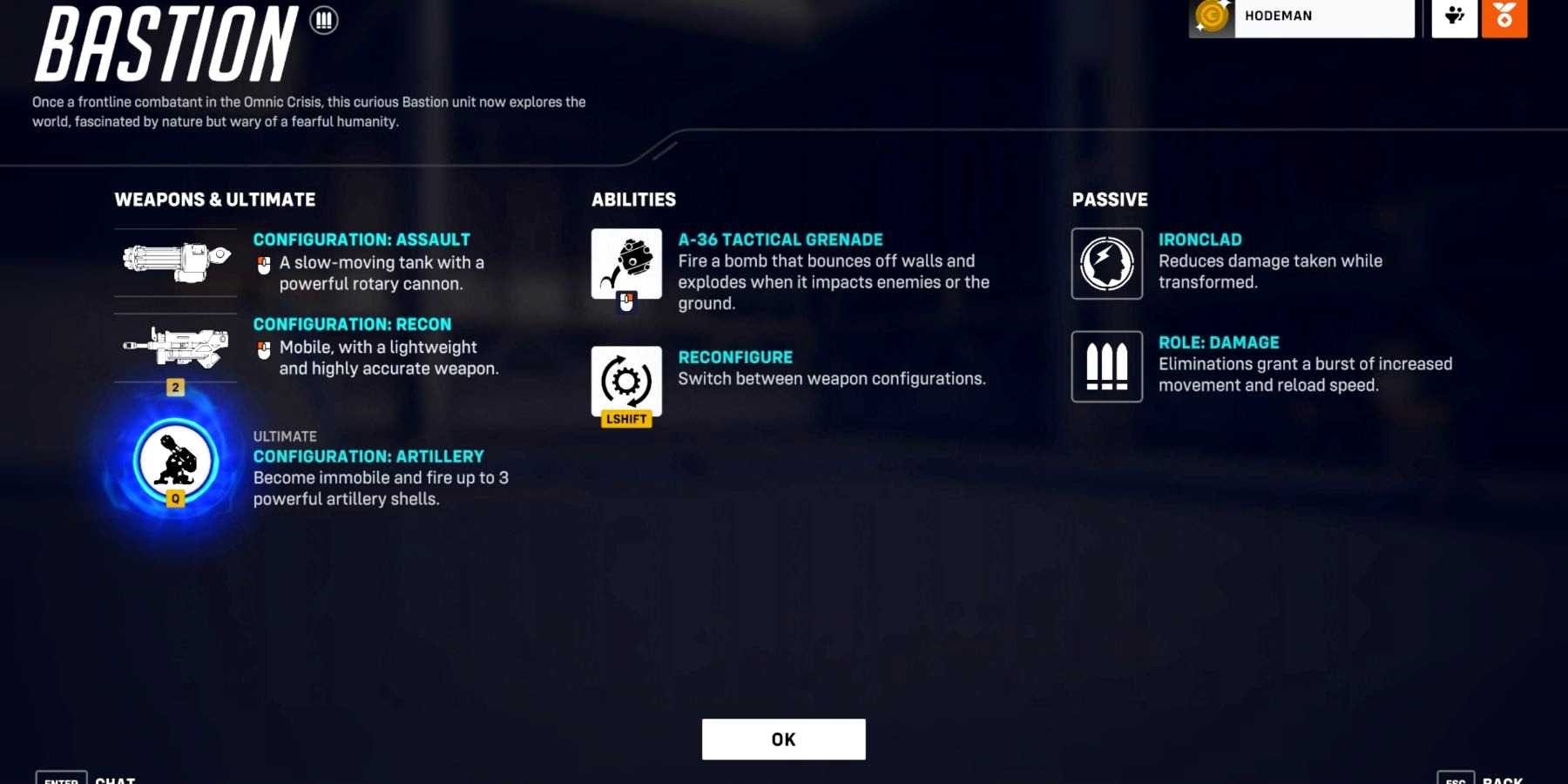 Во-первых, его ультимейт «Конфигурация: Танк» был заменен на «Конфигурация: Артиллерия». С этим новым ультом Бастион запирается в одном месте и запускает в небо три ракеты, которые вы выбираете, куда они приземлятся. У вас есть время, пока таймер не истечет, чтобы выбрать их местоположение, поэтому вам нужно быть быстрым, чтобы все трое приземлились. Поскольку все так много двигаются, вам придется предсказывать, куда они идут, и вести их с помощью ракет. Каждая ракета наносит 200 урона, всего 600 между тремя из них, но вы будете широко открыты для врагов, таких как Крысавчик, когда он использует Riptire. Бастиона можно оглушить и выбить из его ульты, и он может стрелять ракетами через крышу зданий.