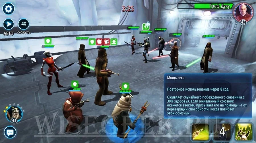 - Если особая способность доступна — коснитесь для активации. Для инфо коснитесь и держите.