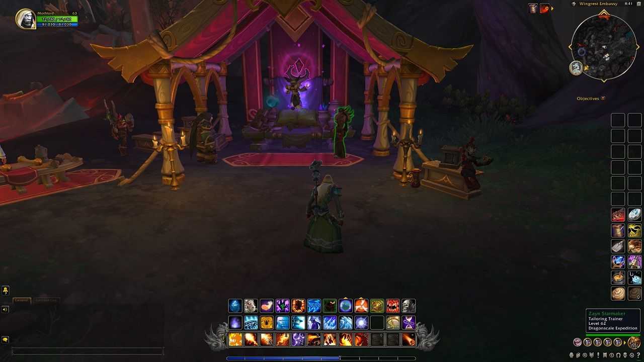 Поднимитесь по лестнице, поверните направо и продолжайте идти, пока не дойдете до палатки рядом со статуей дракона; тот со светящимися фиолетовыми огнями. Зейн Стармейкер, один из NPC, преподает портняжное дело с Драконьих островов. Находясь там, не стесняйтесь поговорить с Виено и выбрать наложение чар в качестве своей второй профессии. Портняжное дело и Наложение чар прекрасно дополняют друг друга.