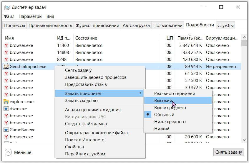 4) Выберите вкладку Подробности . Найдите GenshimImpact.exe . Щелкните его правой кнопкой мыши и выберите Установить приоритет> Высокий .