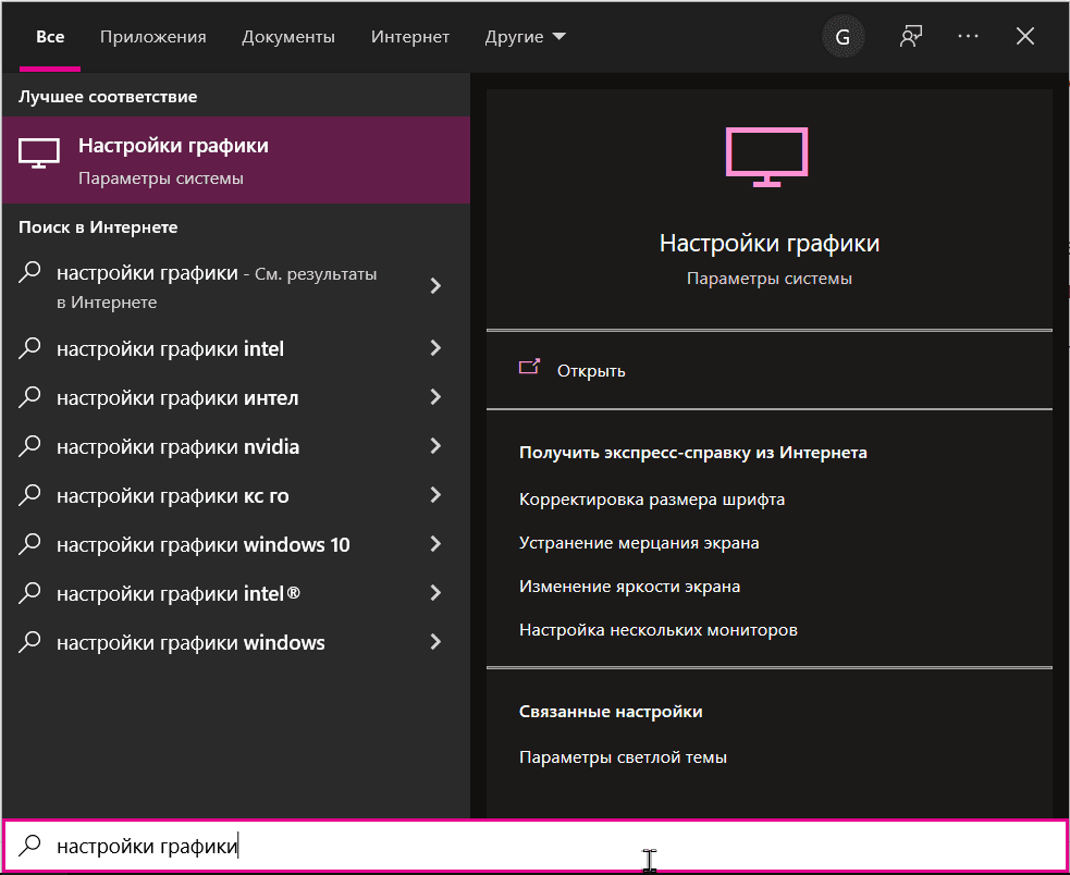 1) В поле поиска введите настройки графики . Затем в результатах нажмите Настройки графики .