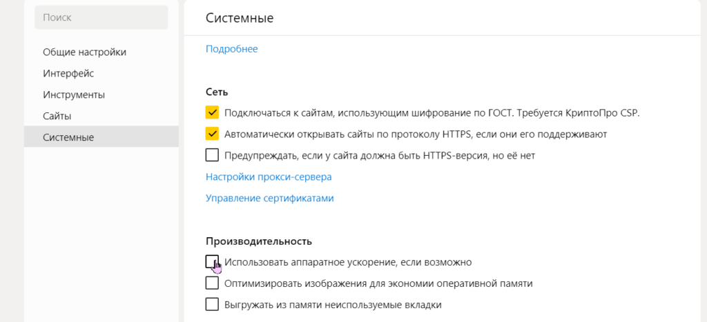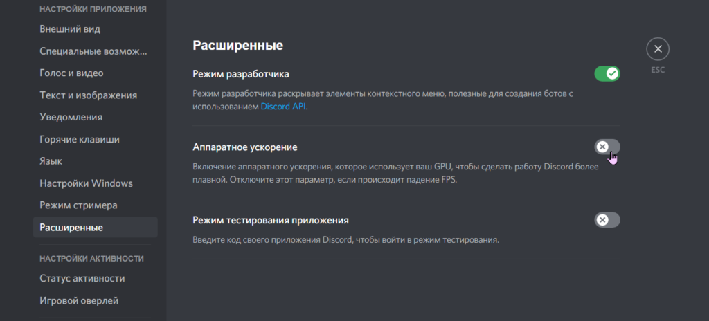 - Отключите тумблер параметра «Аппаратное ускорение», включенного автоматически (также можете отключить Режим разработчика);
