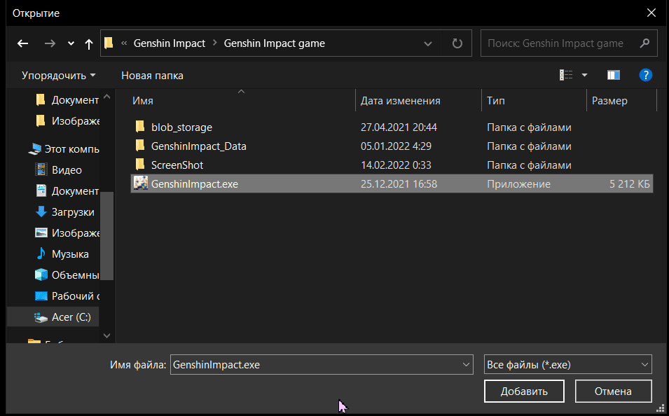 4) Щелкните GenshinImpact.exe и нажмите Добавить .
