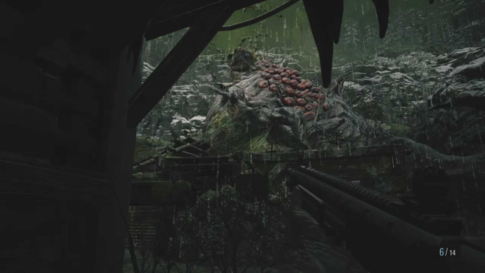 Босс-рыба. Абсолютное новшество в резиденте.Никогда такого не было и вот опять. Тактика такая же как и с Димитреску, только круг больше и рыбина иногда залезает на крышу и устраивает кислотный дождь, от которого надо прятаться под небольшими крышами.(а ещё он блюёт через стены иногда)