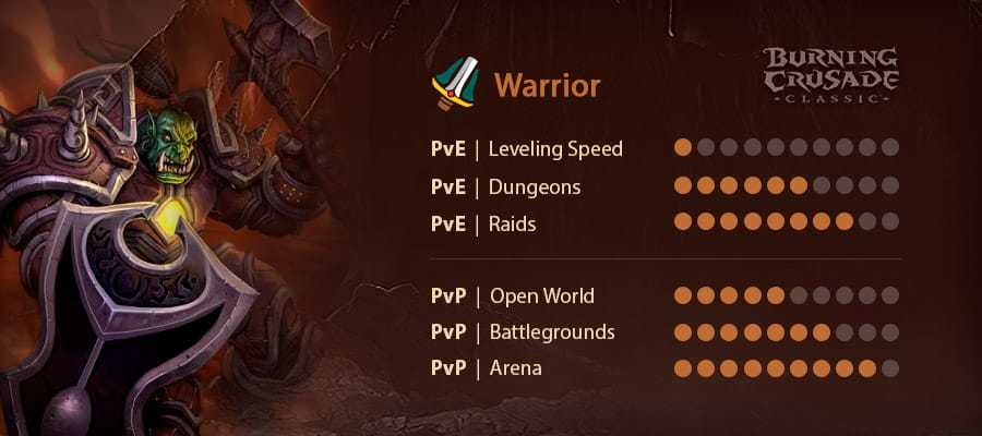 Когда дело доходит до PvE все специализации жизнеспособны. Воины защиты — проверенные танки и определенно лучший выбор для основного танка. Оружие также может неплохо проявить себя в Burning Crusade, особенно теперь, когда у обеих фракций есть тотем шамана неистовства ветра. Напоминаем, что Shattering Throw не был добавлен в игру до Wrath of the Lich King, поэтому воины не могут сломать божественный щит, как священники, что является для них довольно классной новой способностью. Еще одним недостатком воинов является то, что они очень медленно развиваются, как и в Vanilla, у них высокая зависимость от снаряжения, особенно когда дело доходит до оружия, и им трудно выполнять некоторые из более сложных квестов. Сразиться с более чем одним мобом за раз в качестве воина может быть проблемой, и вы обычно умрете, если это произойдет, в довершение всего низкая мобильность, и это переводит воинов на самый сложный и медленный класс для уровня. Многие утверждают, что воины были побеждены в Burning Crusade, и в этом есть некоторые достоинства. Воины — отличный выбор как для PvE, так и для PvP, если вы можете измельчить своего воина до 70.