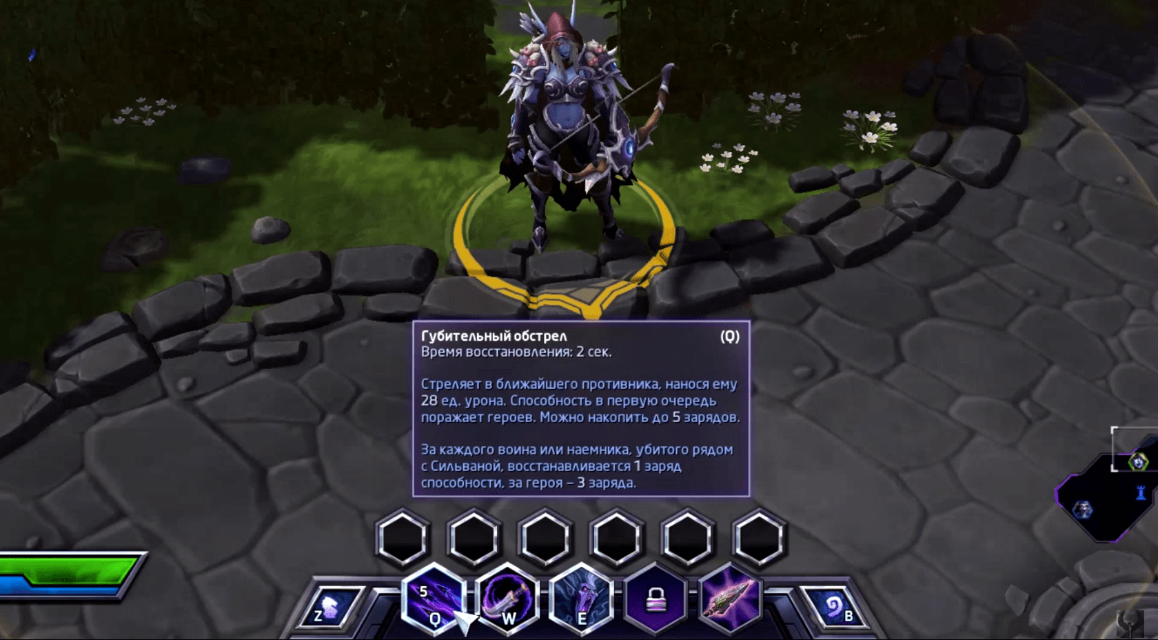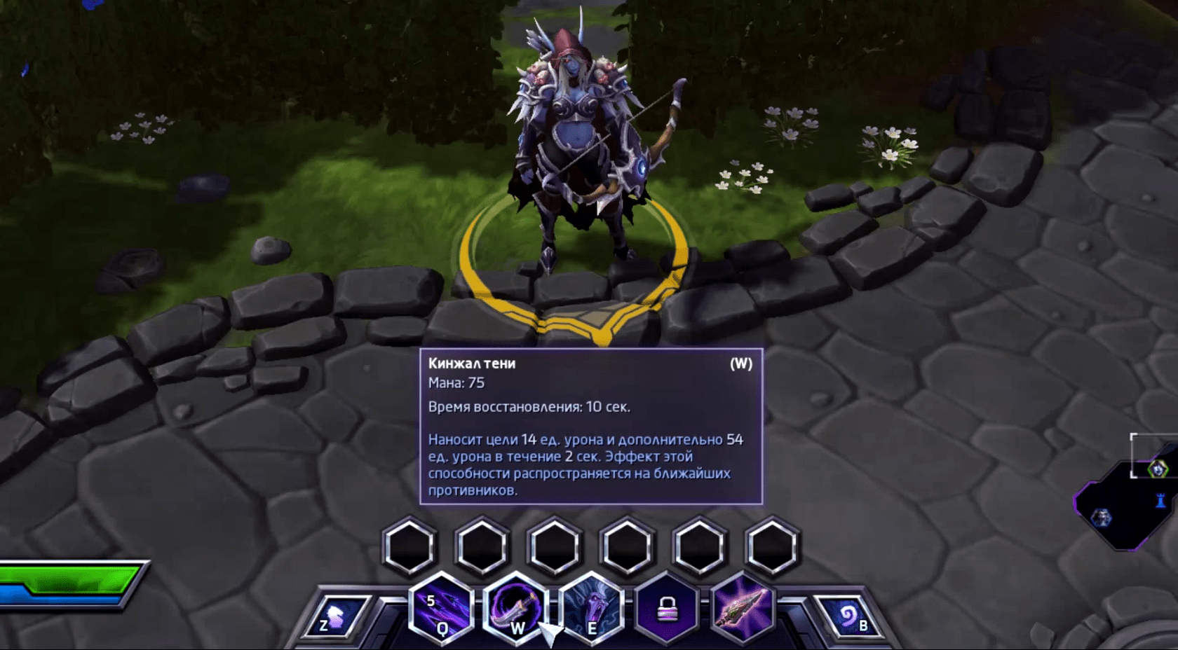Сильвана бросает кинжал, который наносит периодический урон распространяется и на находящиеся рядом цели. Хорошая способность для файтов, но не нужная для пуша