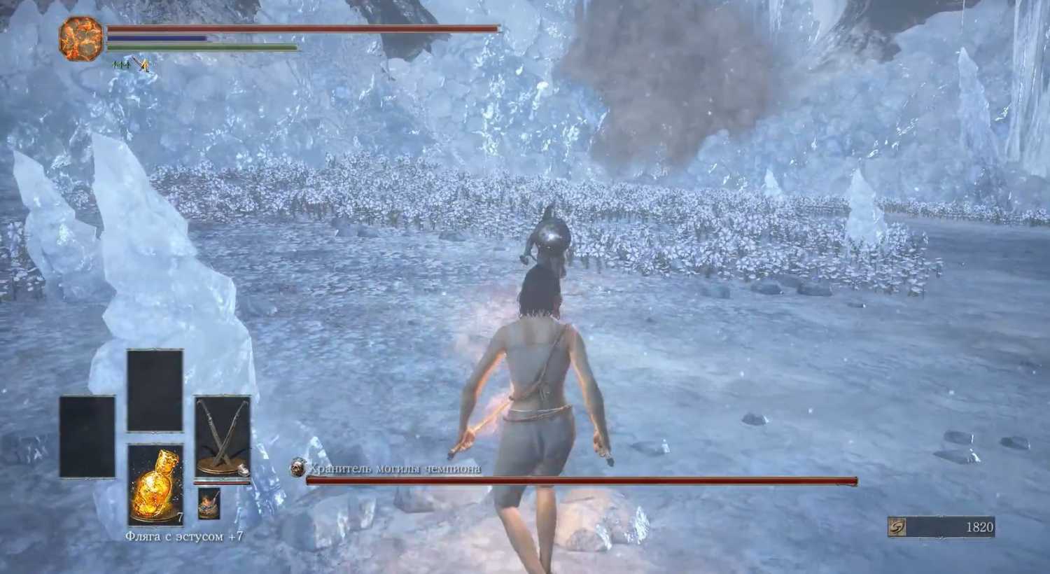 Хорошая тактика – постараться убить хранителя быстро (для этого есть окно между атаками, когда он трубит). На нем можно использовать темную руку и священное пламя.